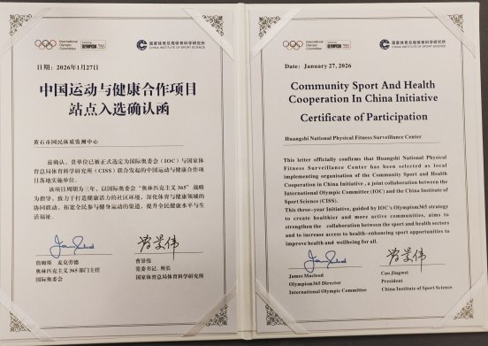 1月27日,黄石市国民体质监测中心正式获颁国际奥委会与国家体育总局体育科学研究所联合出具的中国运动与健康合作项目站点确认函,标志着我市成功跻身该国际合作项目全国首批落地实施单位,黄石运动健康促进工作步入国际化协同发展新阶段。