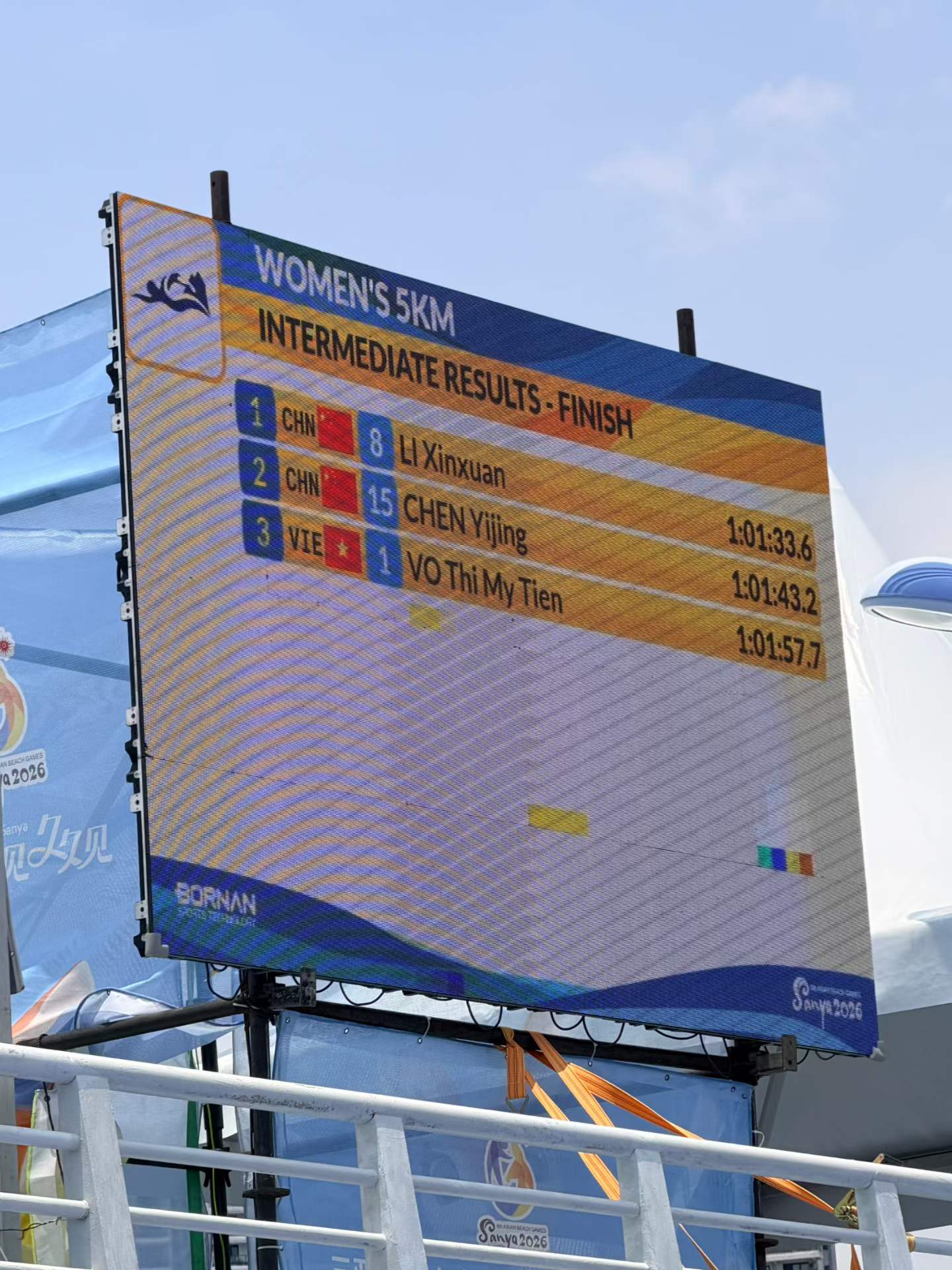 比赛过程中,李馨璇展现了极强的耐力和战术执行力。面对开放海域复杂的水流条件,她始终保持着稳健的节奏,并在冲刺阶段脱颖而出。最终,李馨璇率先到达终点,队友陈奕静紧随其后获得银牌,中国队在该项目上实现了金银牌的包揽。这枚金牌也是中国体育代表团在本届亚沙会上获得的第八枚金牌。
