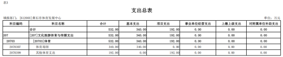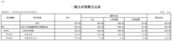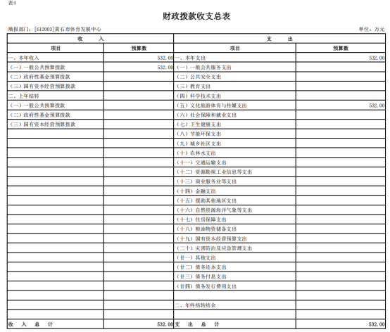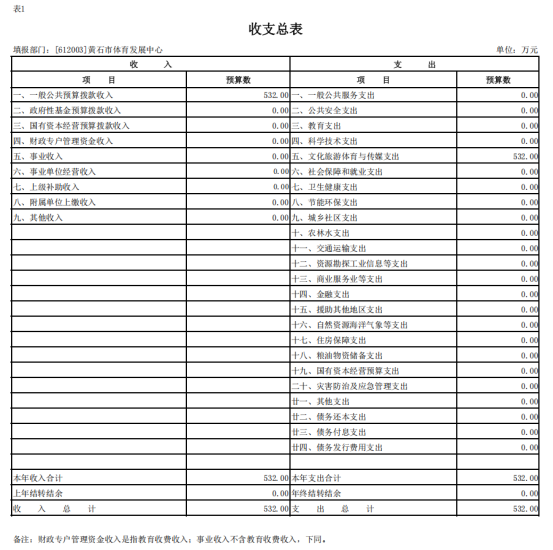 按照综合预算的原则,黄石市体育发展中心所有收入和支出均纳入部门预算管理。收入包括:一般公共预算拨款收入;支出包括:一般公共服务支出;2026年度收支总预算 532万元。