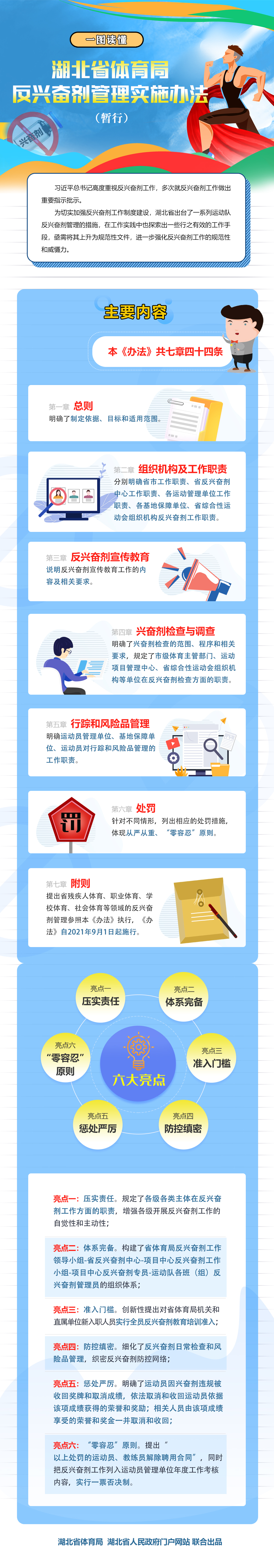 第七章附则,提出省残疾人体育、职业体育、学校体育、社会体育等领域的反兴奋剂管理参照本《办法》执行,本《办法》自2021年9月1日起施行。