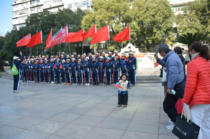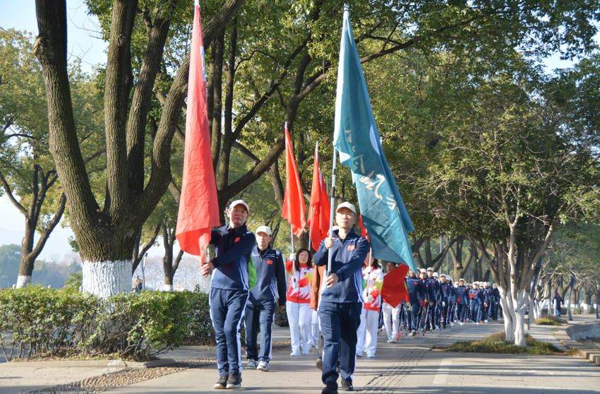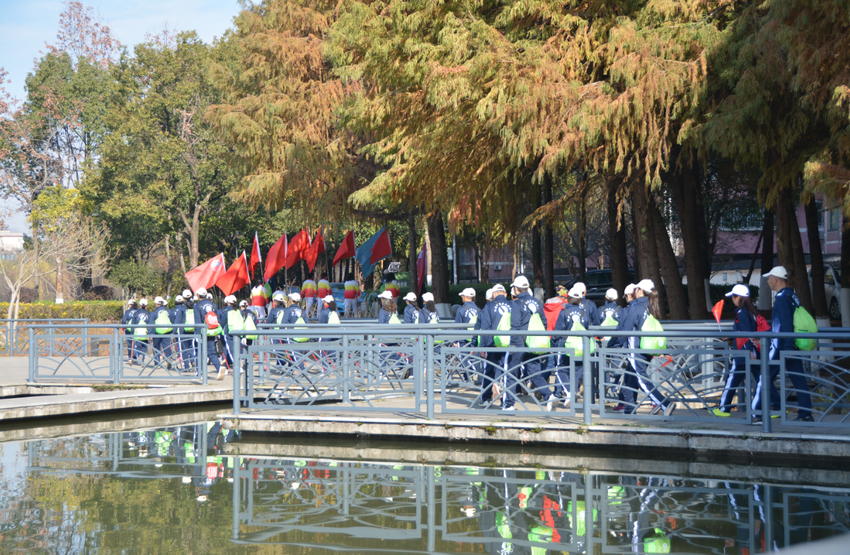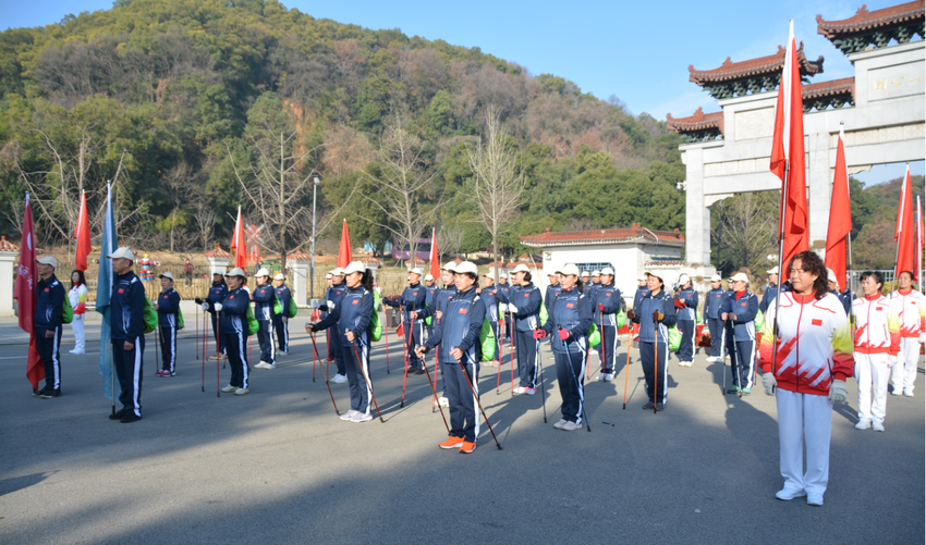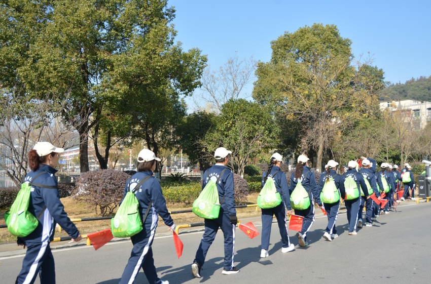 队旗先行,红旗方阵随后,健步走队伍开启了“迎新春”环磁湖健步之旅。队员们身着统一的蓝色队服,头戴米色帽子,肩背绿色背包,从团城山公园大门出发,途经杭州路磁湖栈道、湖滨大道,抵达终点桂花湾法制广场。
