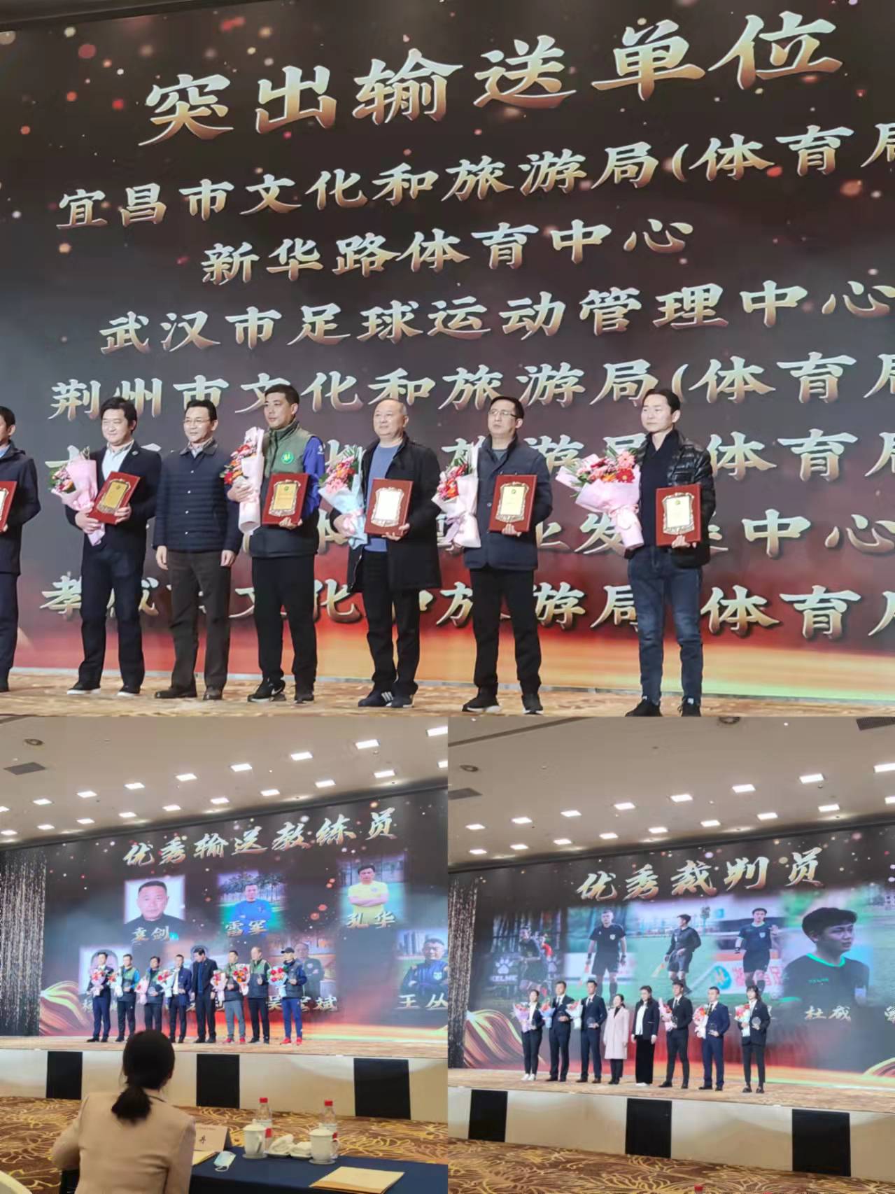 12月23日,由湖北省体育局足管中心、湖北省足球协会举办的2021年湖北足球工作总结表彰大会在枝江市举行。省体育局副局长水兵出席会议并为获奖单位授奖。黄石市体育事业发展中心荣获突出输送单位奖,教练员吴宏斌、汤满分别荣获优秀输送教练员奖、优秀裁判员奖。