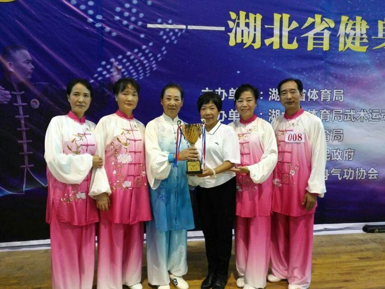 黄石健身气功协会获奖队员与张春芬副主席、协会秘书长罗红珍及省武管中心杨厚娟部长合影。