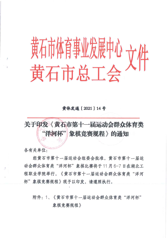 关于印发《黄石市第十一届运动会群众体育类“洋河杯”象棋竞赛规程》的通知