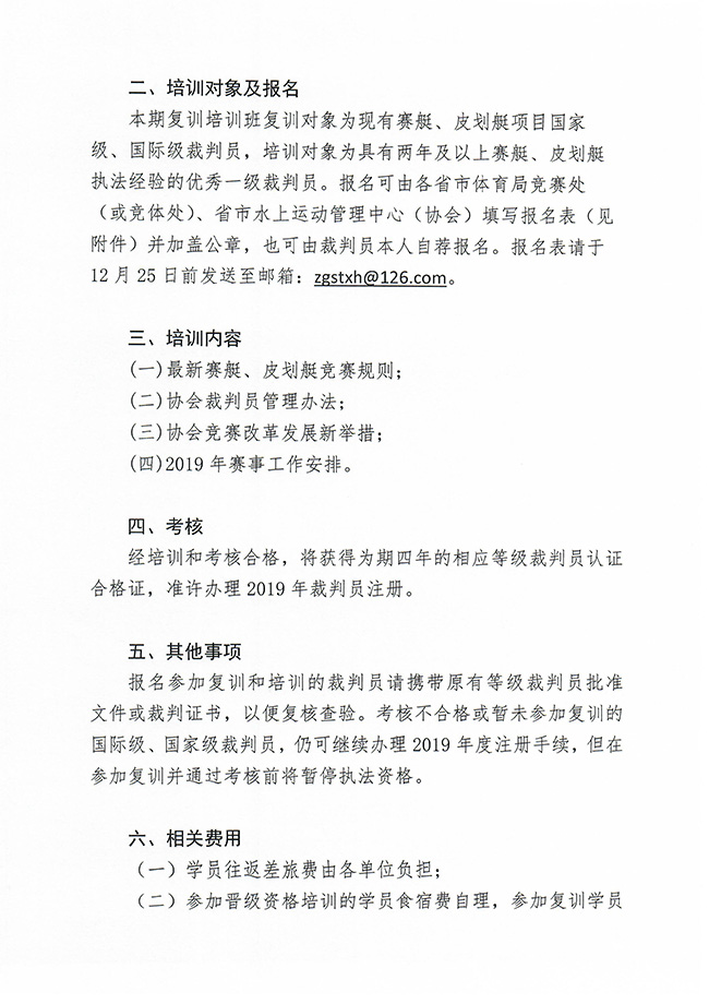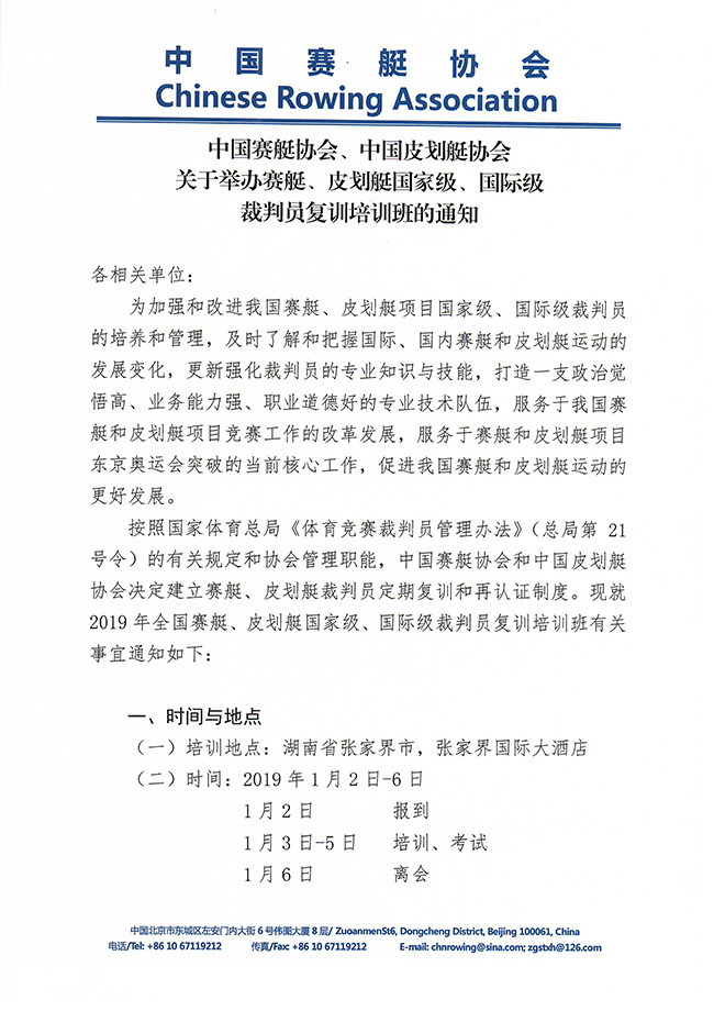 中国赛艇协会、中国皮划艇协会关于举办赛艇、皮划艇国家级、国际级裁判员复训培训班的通知